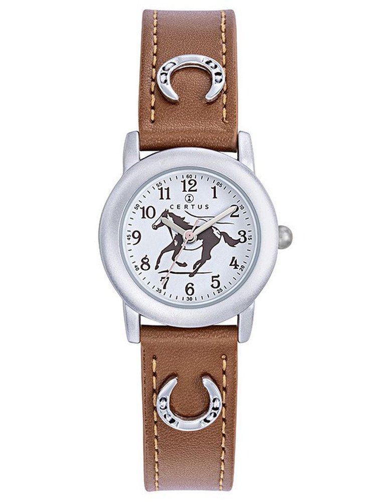 Montre Certus Junior 647705 : boîtier rond argenté 28 mm, cadran blanc chiffres marron, aiguilles argentées, bracelet synthétique marron à motif fer à cheval, étanche 3 ATM.