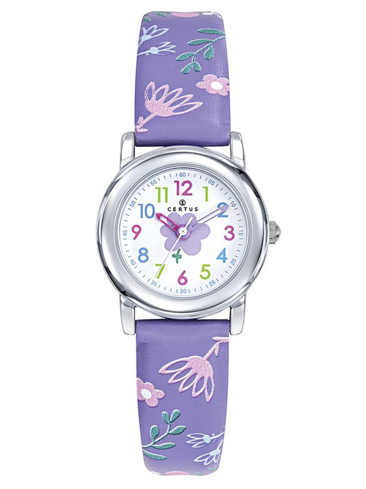 Montre enfant Certus Junior 647718 – cadran blanc à chiffres multicolores, bracelet violet décoré de fleurs, boîtier argenté 27 mm, étanche 3 ATM.