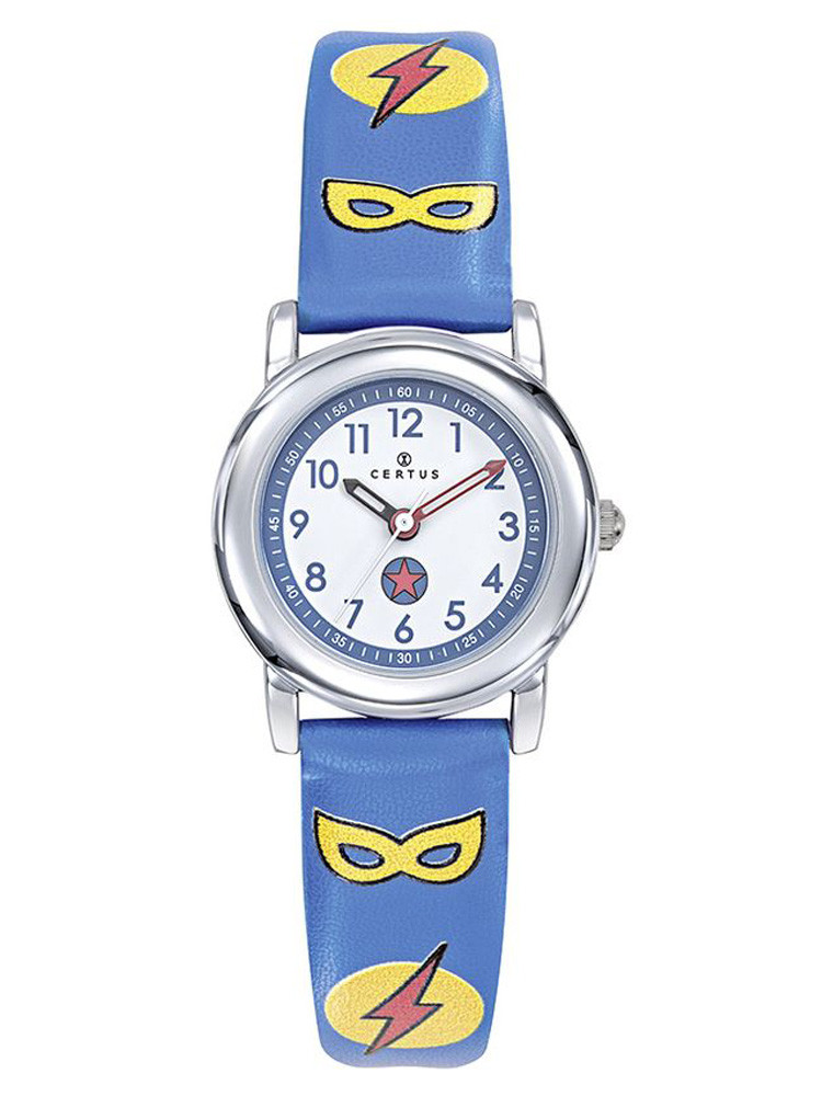 Montre enfant Certus Junior 647720 – cadran blanc à chiffres bleus, bracelet bleu décor super-héros, boîtier rond argenté 27 mm, étanche 3 ATM.