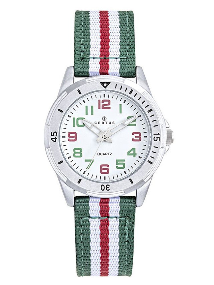 Montre enfant Certus Junior 647723 – cadran blanc chiffres verts et rouges, bracelet tissu tricolore vert-blanc-rouge, boîtier argenté 32 mm, étanche 3 ATM.