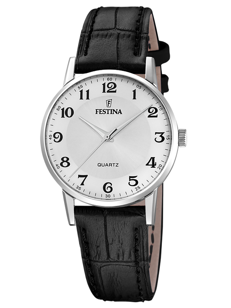 Montre femme Festina F20691/1 en acier avec cadran blanc et bracelet cuir noir. Mouvement quartz, verre minéral, étanchéité 3 ATM. Élégance fine et intemporelle.