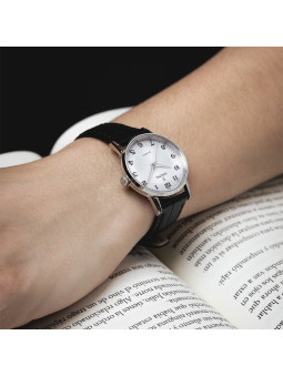 Le cadran blanc épuré, rehaussé de trois aiguilles fines, s’accorde parfaitement avec le bracelet en cuir noir pour un contraste chic et moderne.