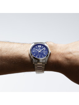 Le cadran bleu profond contraste avec les trois aiguilles pour une lecture de l’heure claire et précise. La montre intègre également un calendrier pratique, tandis que le verre minéral protège efficacement le cadran.