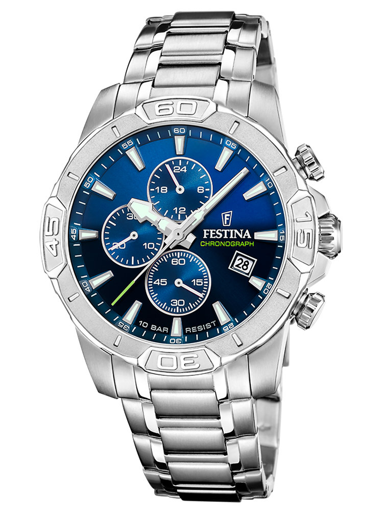 Montre homme Festina F20704/4 chronographe acier. Cadran bleu, mouvement quartz, calendrier, étanche 10 ATM. Élégante et sportive à la fois.