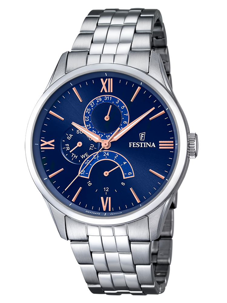 Montre homme Festina F16822/3 multifonction acier. Cadran bleu, jour/date, mouvement quartz, étanche 5 ATM. Élégante et pratique au quotidien.