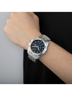 Cette montre est équipée d’un mouvement quartz précis et dispose d’un affichage jour/date sur 6 aiguilles pour vous permettre de rester toujours à l’heure. Le verre minéral protège efficacement le cadran contre les rayures et le bracelet en acier inoxydable gris assure confort et durabilité. Le fermoir double bouton poussoir garantit un maintien sûr au poignet.