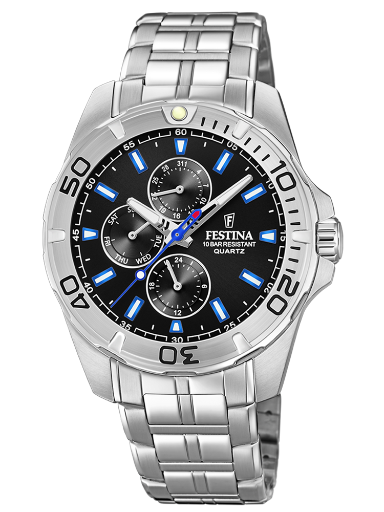 Montre homme Festina F20445/6 multifonction acier. Cadran noir, jour/date, mouvement quartz, étanche 10 ATM. Élégante et pratique au quotidien.