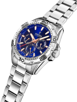 Montre homme Festina F20623/2 acier multifonction. Cadran bleu, 6 aiguilles, affichage jour et date, mouvement quartz, étanche 10 ATM. Élégante et robuste.