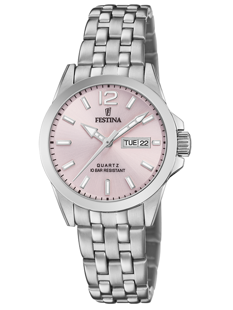 Montre femme Festina F20455/2 en acier inoxydable, cadran rose, mouvement quartz avec date. Étanche 10 ATM. Élégante et moderne, parfaite au quotidien.
