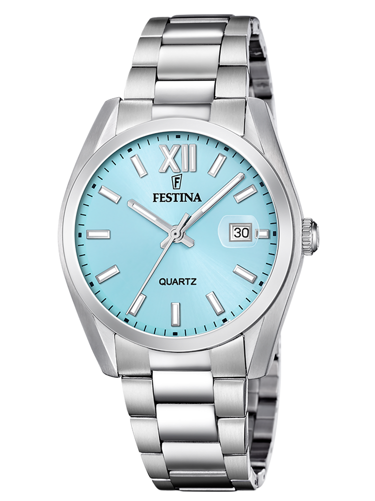 Montre homme Festina F20707/2 en acier inoxydable avec cadran bleu clair. Mouvement quartz précis, date et étanchéité 5 ATM. Élégance et modernité.