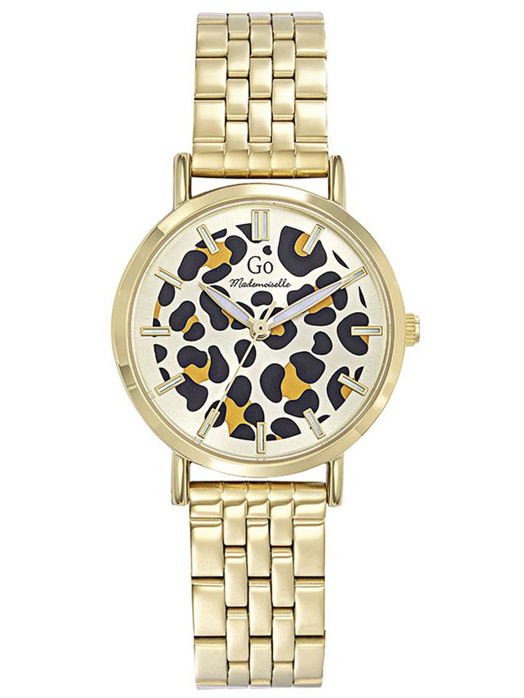 Montre femme Go Mademoiselle 695635 – cadran doré motif léopard, bracelet métal doré à boucle déployante, boîtier rond 30 mm, étanche 3 ATM.