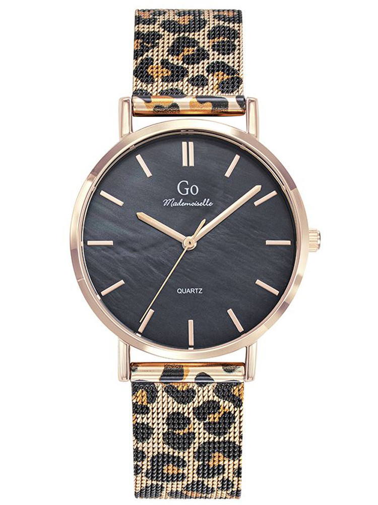 Montre femme Go Mademoiselle 695677 quartz avec boîtier doré rose 34 mm, cadran nacre noir et bracelet acier doré rose motif léopard. Élégante et étanche 5 ATM.