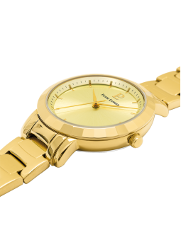 La montre GALIERA 003L542 est une pièce féminine et raffinée, pensée pour celles qui aiment les accessoires élégants et intemporels. Avec son boîtier rond en acier doré de 32 mm et son cadran doré soleillé, elle séduit par son éclat lumineux et harmonieux.
