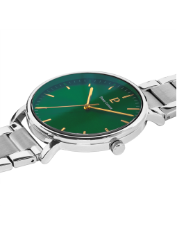 Montre homme ESSENTIAL 251G171 : boîtier acier argenté 40,5 mm, cadran vert soleillé, aiguilles dorées, bracelet acier argenté, mouvement quartz, étanche 50M.