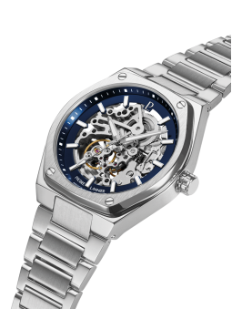 Son boîtier rond en acier inoxydable finition mat + brillant, de 42,5 mm, lui confère une allure robuste mais raffinée. Le cadran bleu soleillé capte la lumière avec élégance, complété par des aiguilles argentées/blanches pour une lisibilité optimale.