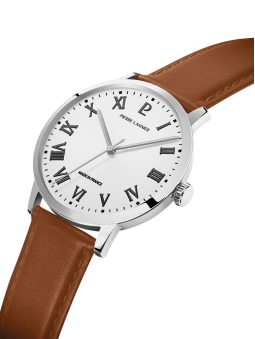 Montre homme Pierre Lannier Interval 255G104, cadran blanc, boîtier acier 40 mm, bracelet cuir brun, mouvement quartz 3 aiguilles.