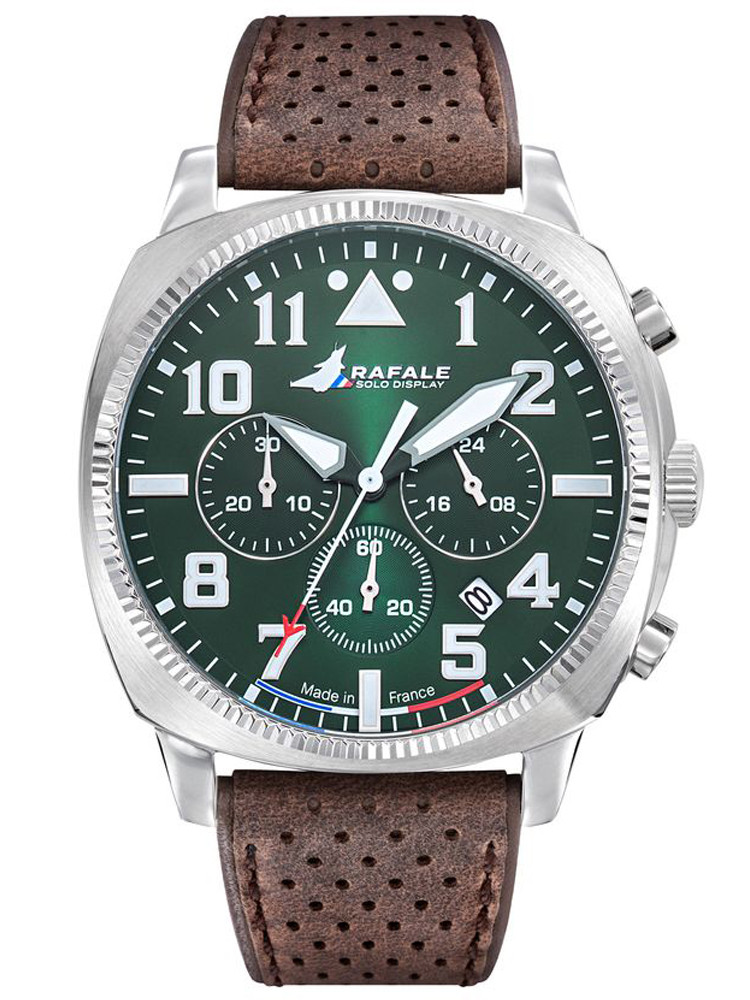 Montre homme RAFALE 666026 – boîtier carré acier 44 mm, cadran vert, chronographe, bracelet cuir marron, affichage du jour, étanche 10 ATM, mouvement quartz.