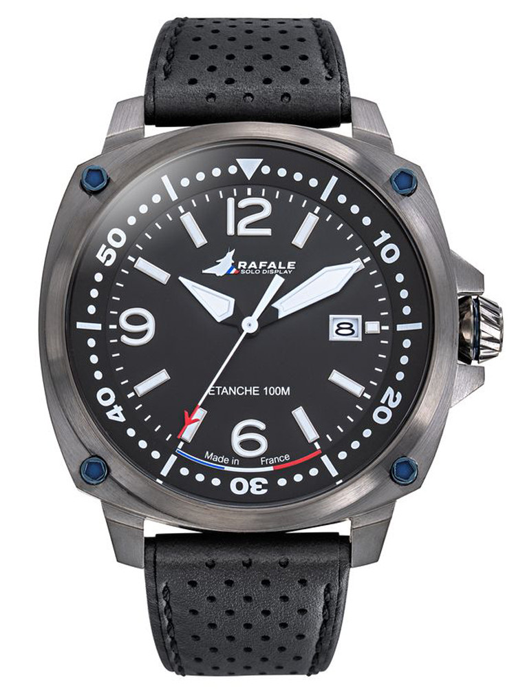 Le bracelet en cuir noir, confortable et élégant, est maintenu par une boucle classique, offrant un port sûr et agréable. La RAFALE 666035 allie modernité, confort et style masculin pour un look urbain et raffiné.