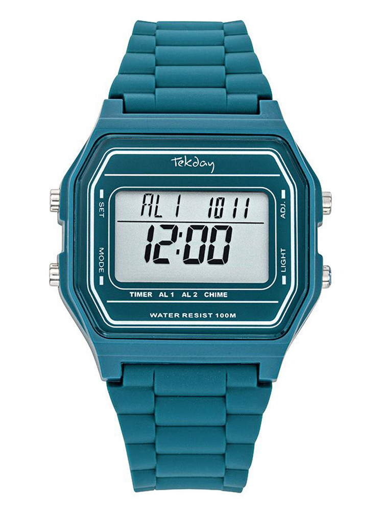 Montre TEKDAY carrée unisexe bleu moyen, bracelet plastique, boucle chromée, étanche 10 ATM, affichage numérique.