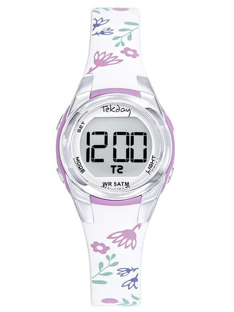 Montre enfant TEKDAY 654947 digitale avec bracelet plastique blanc, affichage date, boîtier 27 mm et étanchéité 5 ATM.